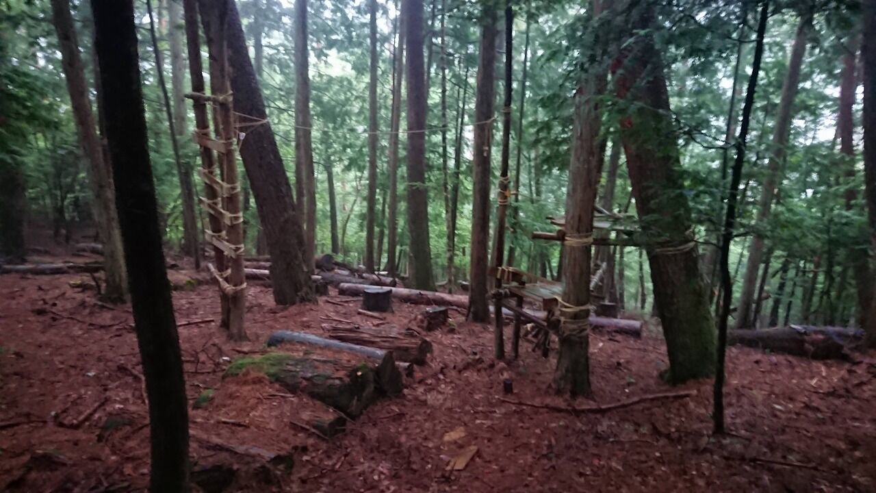 尾根に取りつくと、なんだか楽しそうな手作りフォレストアスレチック場が。