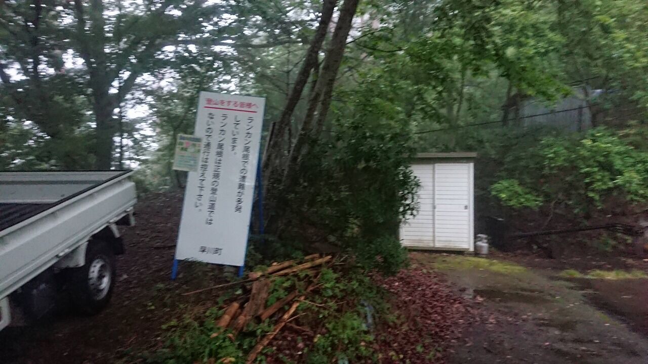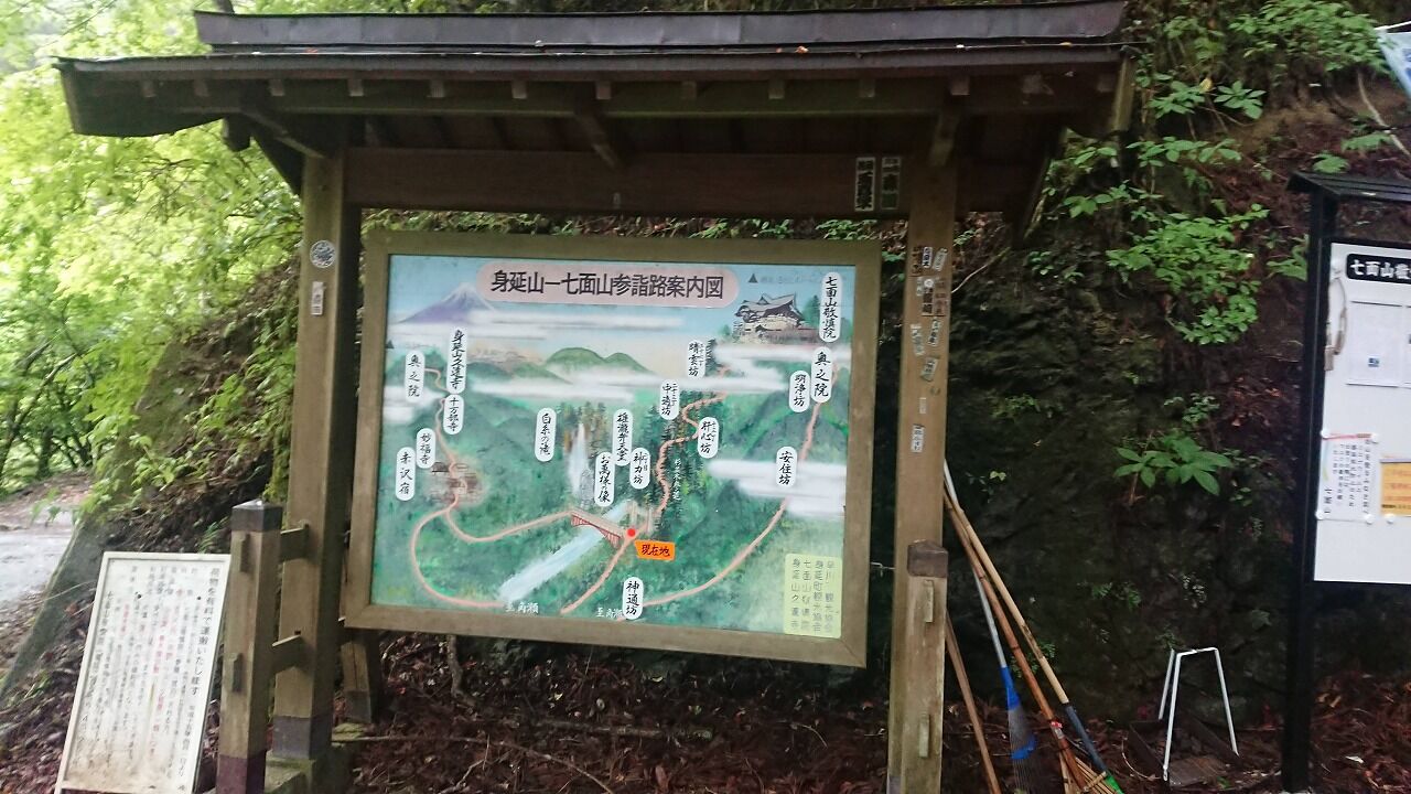 本当は聖東尾根からツエルト泊で南アルプス周回する予定だったのですが、台風とのことで1日だけで登れる笊が岳に変更。笊が岳は朝から曇りで昼前に一時晴れ、夕方雨みたいな天気予報でした。しかし、老平からかなりの雨、7時近くになっても強くなるばかりで、このまま景色もなし、広河原も危ないんだったらまた今度にしようということで下山。せっかくの山の日だし近くに雨でも楽しそうな軽い山は・・・?ということで二百名山の七面山を発見。確か法華経の山。由緒ある登らないといけない山だ。サイトにあるPDFの簡易登山ガイドを見て、なんかこれなら簡単に登れそうだということで改めて七面山登山口へ向かいました。