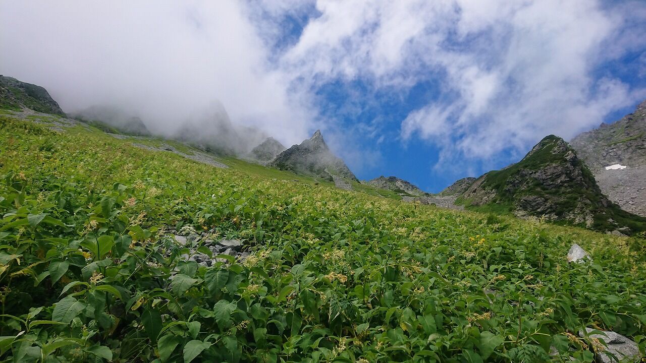 お花畑と涸沢上部の稜線。