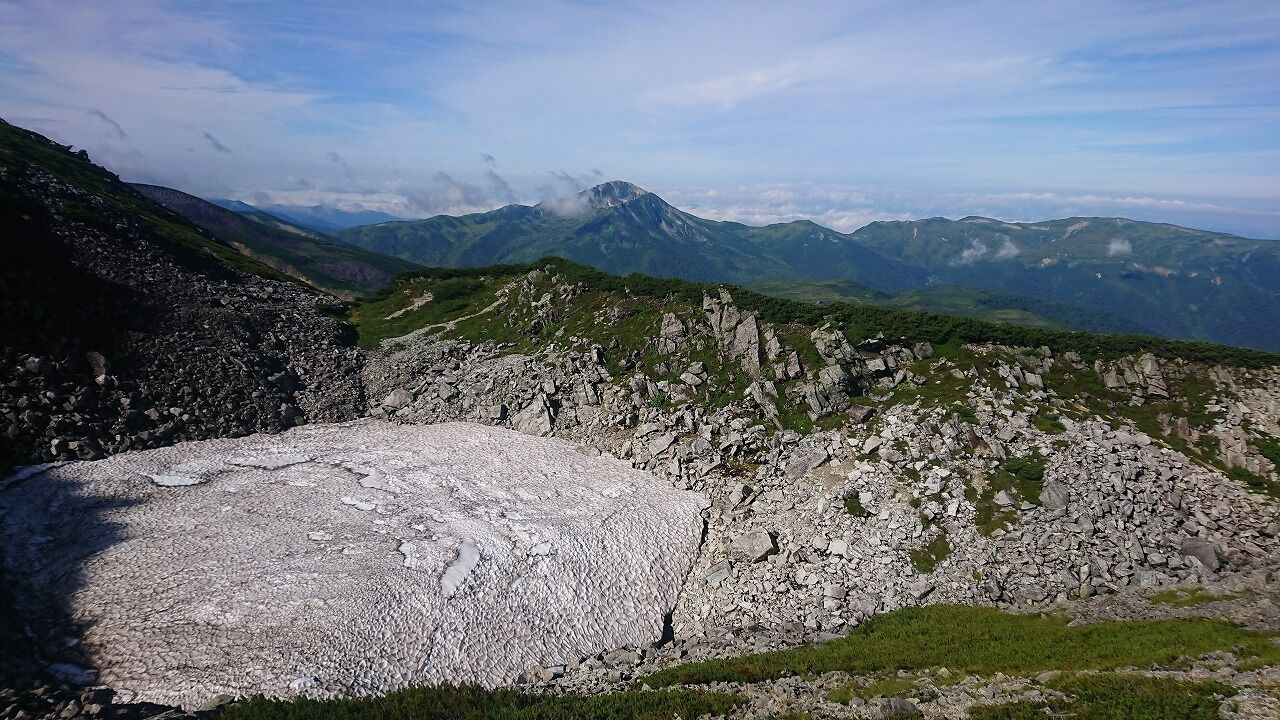 水晶岳の雪渓の向こうに黒部五郎岳。