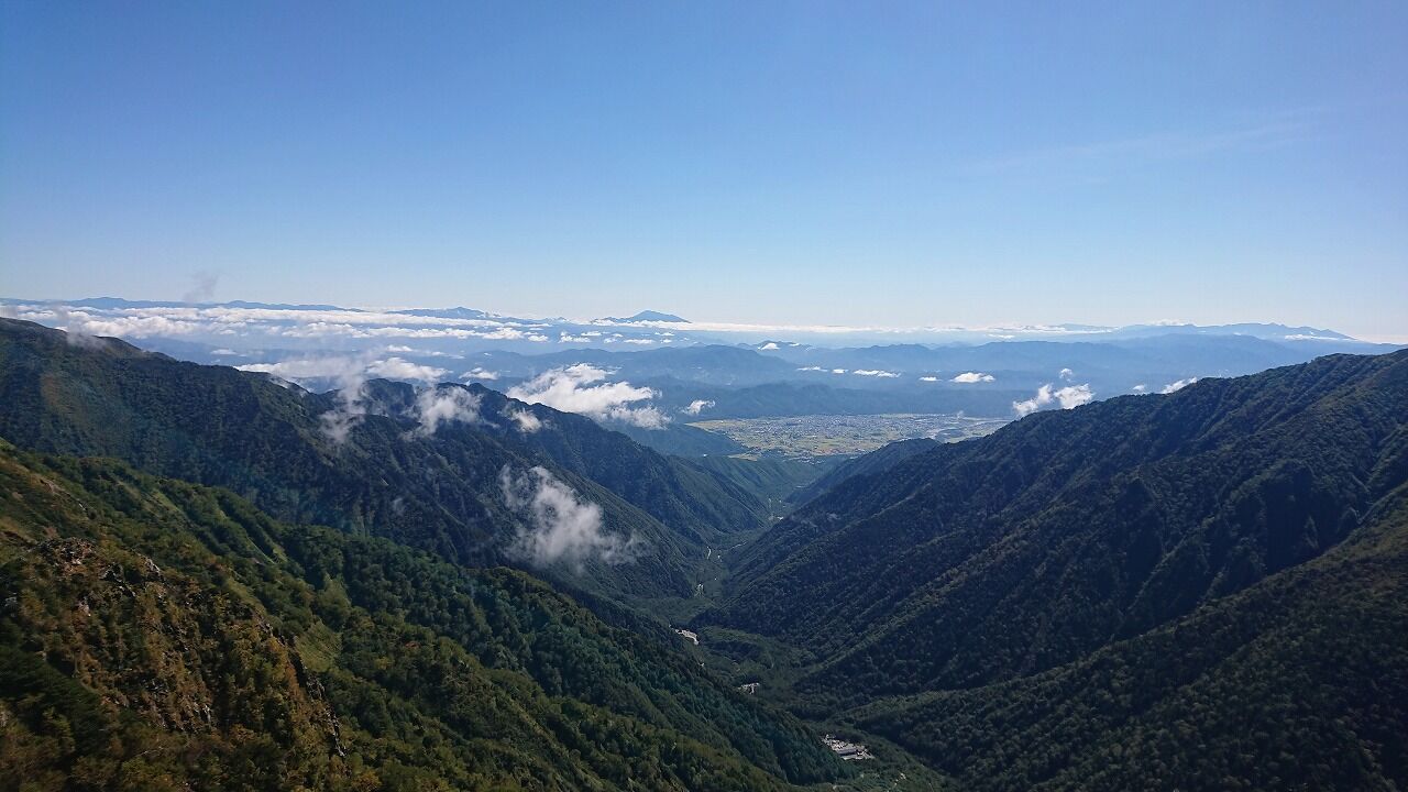 大町市街のはるか向こうに見えるのは浅間山。その左は四阿山でしょうか。