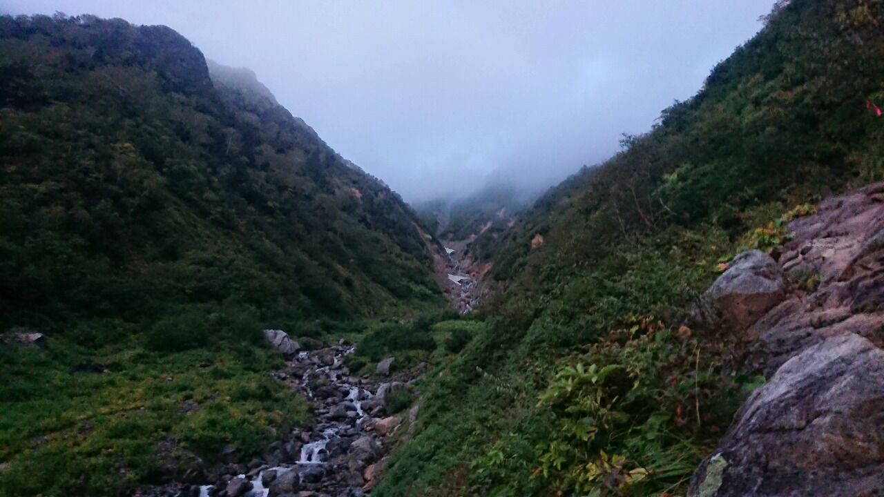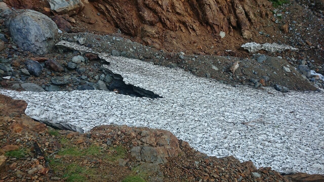 明るくなってきました。小さくなった雪渓が見えています。上は、ガスですね。