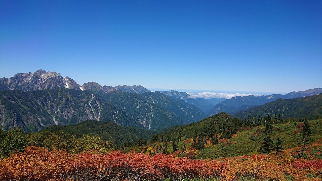 針ノ木峠あたりからずっと新越乗越山荘とか種池山荘とか見えていますが、