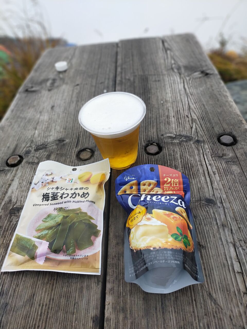 つまみも完璧!大門沢小屋から我慢してきたビールを注文。