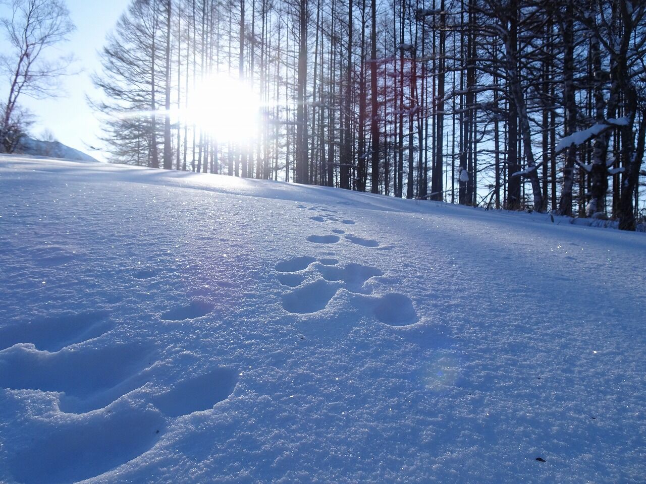 登り口付近の雪です。さらさらのパウダースノーが朝日に輝いています。