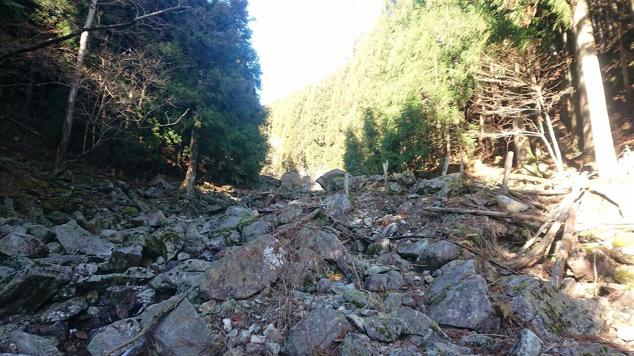 谷は左岸の樹林を行き、途中で右岸に渡るように踏み跡がありました。